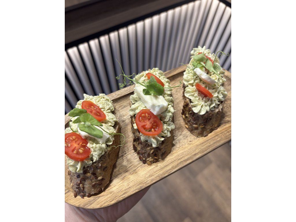 Kanapka s bazalkovou pomazánkou, mozzarella, cherry rajče, bazalka.