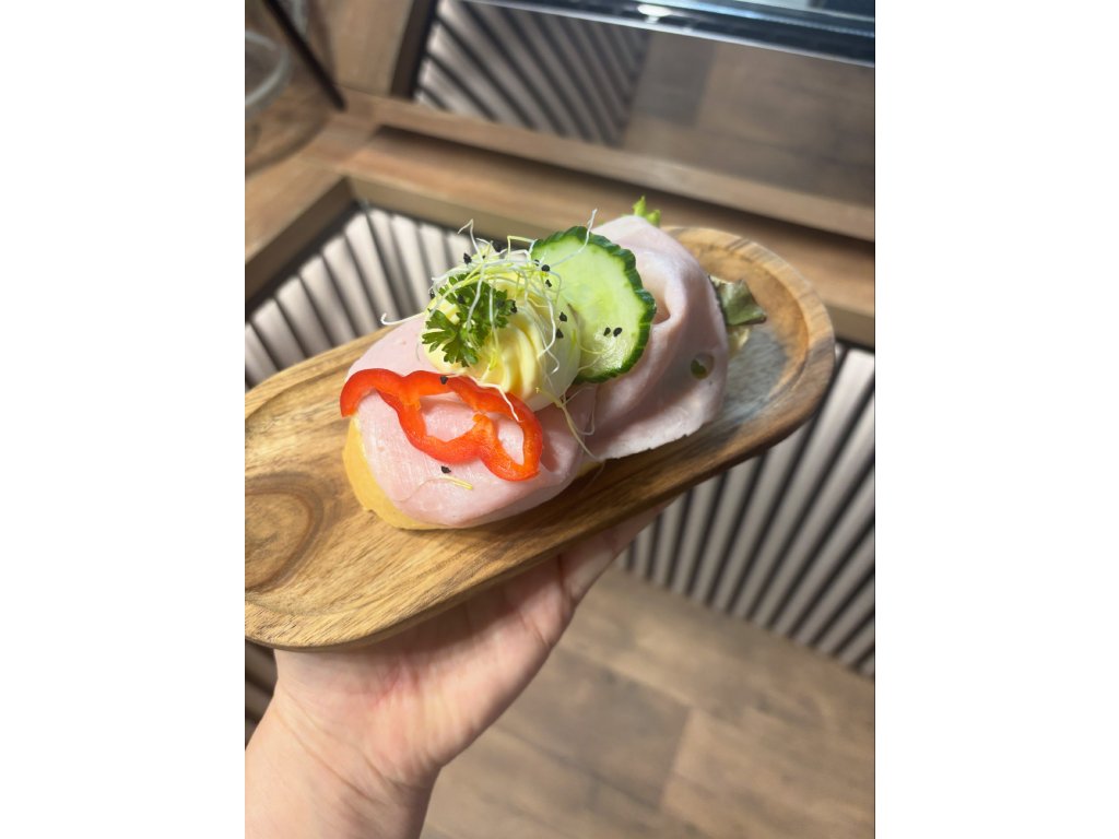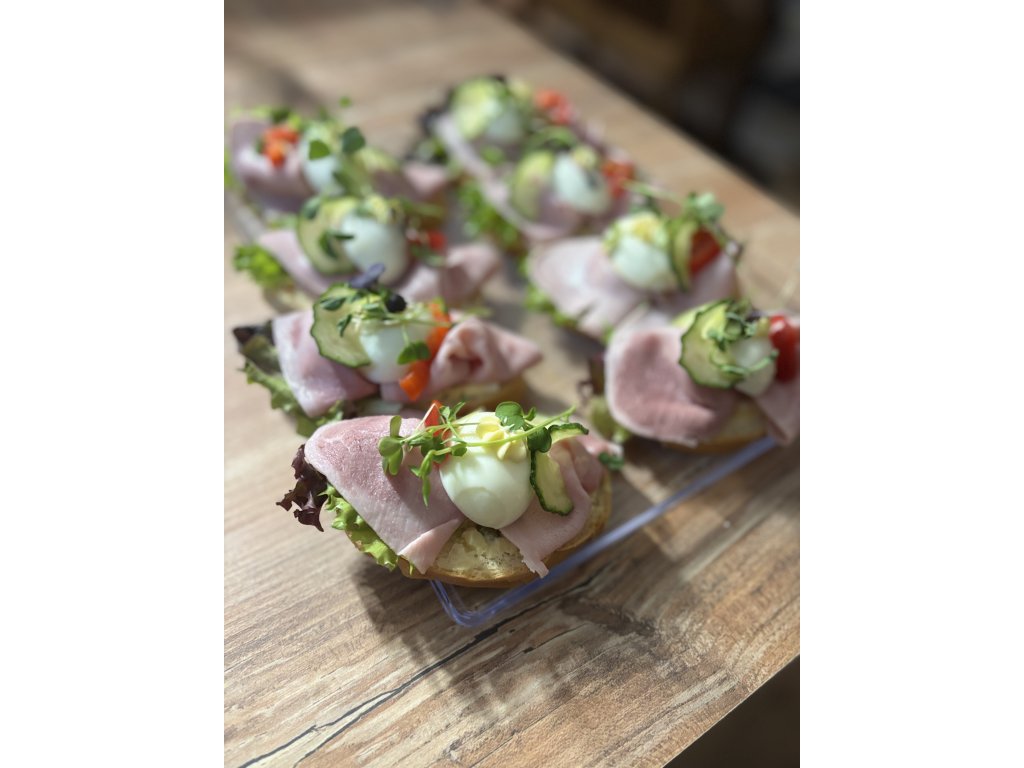 Chlebíček s 1/2 vajíčkem, na našem bramborovém salátu, salát lollo biondo, šunka, majonéza, kyselá okurka, červená paprika, microgreens.