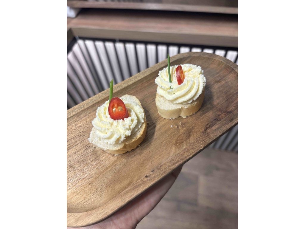 Jednohubka s vajíčkovou pěnou, chilli papričkou a pažitkou