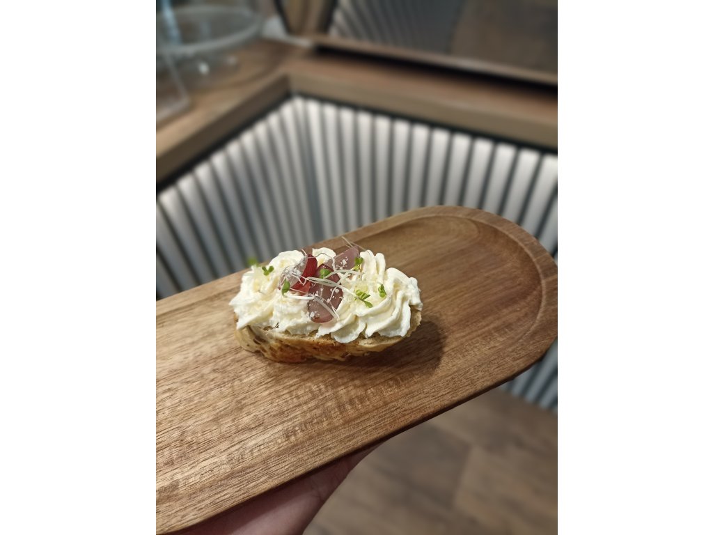 Kanapka s parmezánovou pomazánkou, zdobená hroznovým vínem, a výhonky.