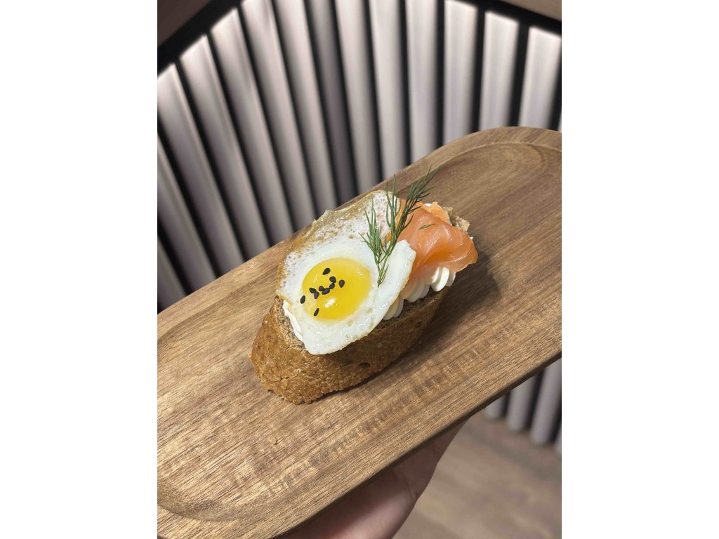 Kanapka na smetanovém sýru, s uzeným lososem, křepelčím vajíčkem, koprem a černým sezamem.