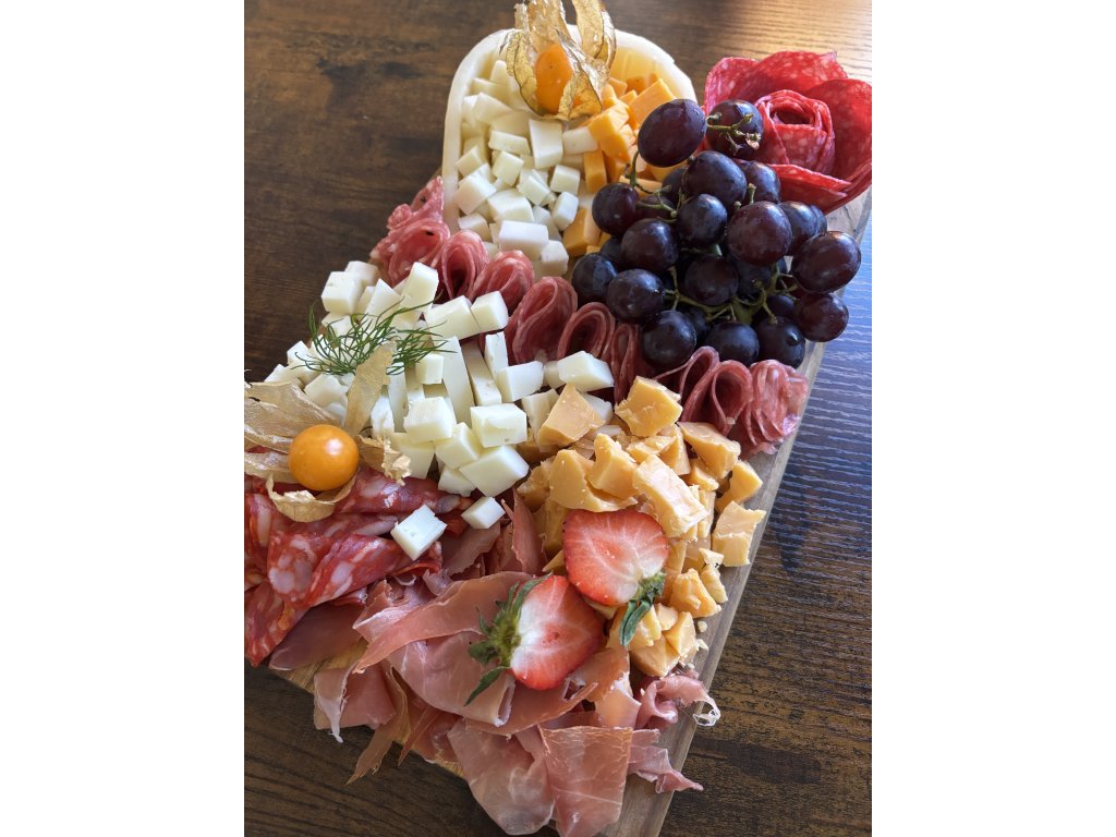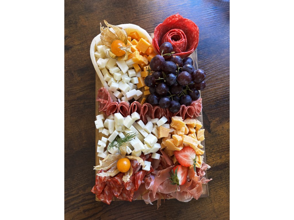 1 kg kvalitních sýrů a salámů, hroznové víno, přízdoba
