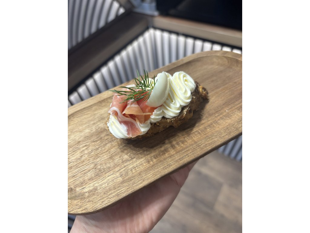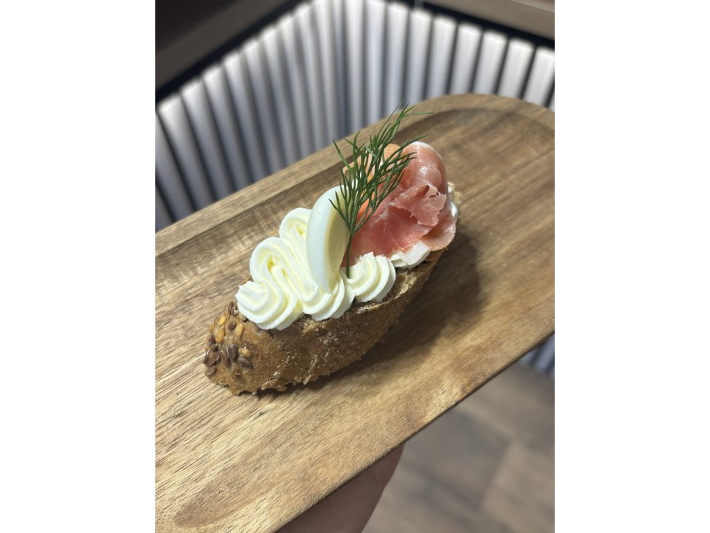 Prosciutto kanapka, smetanový sýr, křepelčí vajíčko