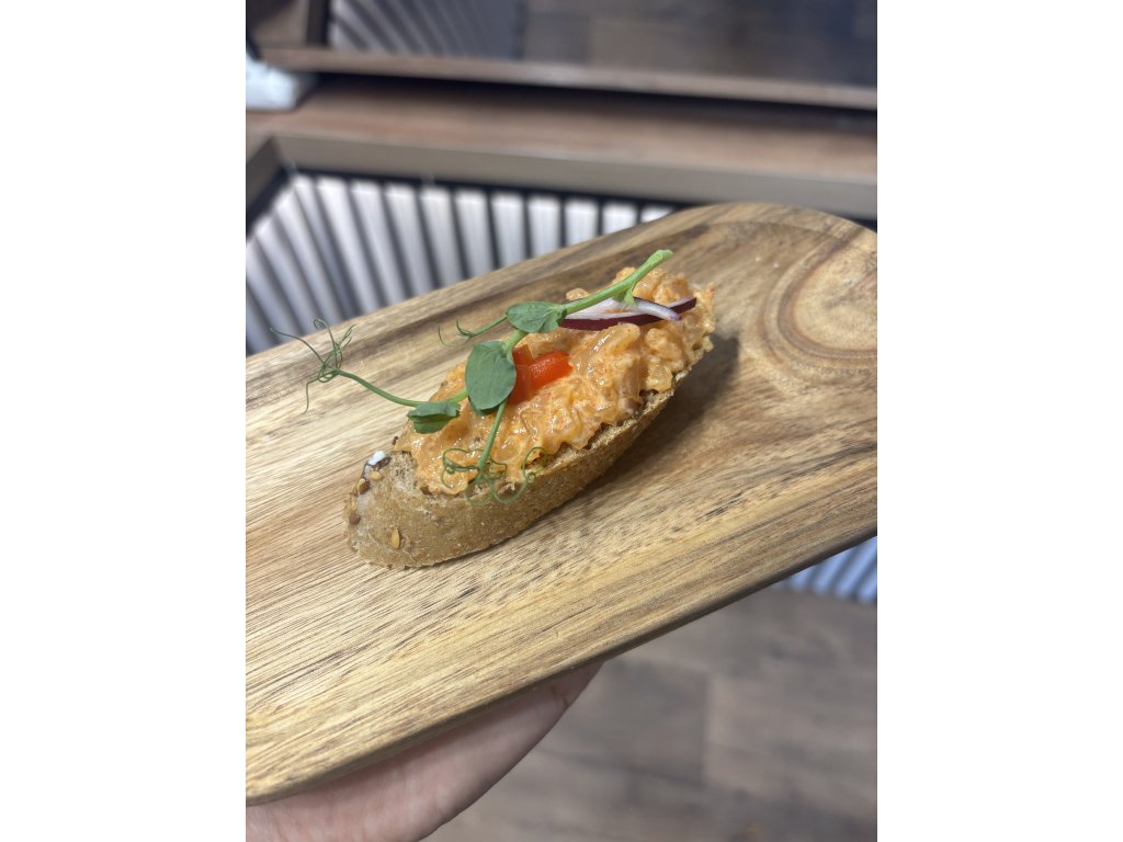 Kanapka s tvarůžkovou pomazánkou, červená cibule, rukola.